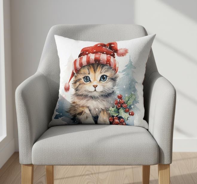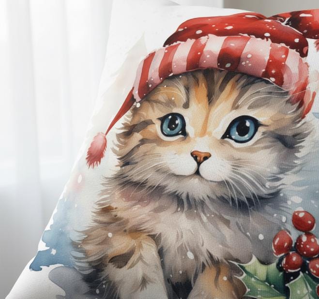 Christmas Cat Velvet Pillow Cover 18x18 Inch, Kitten with Santa Hat, Cozy Winter Holiday Home Decor, Gift for Cat Lovers