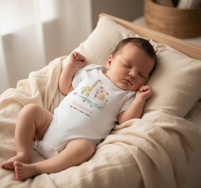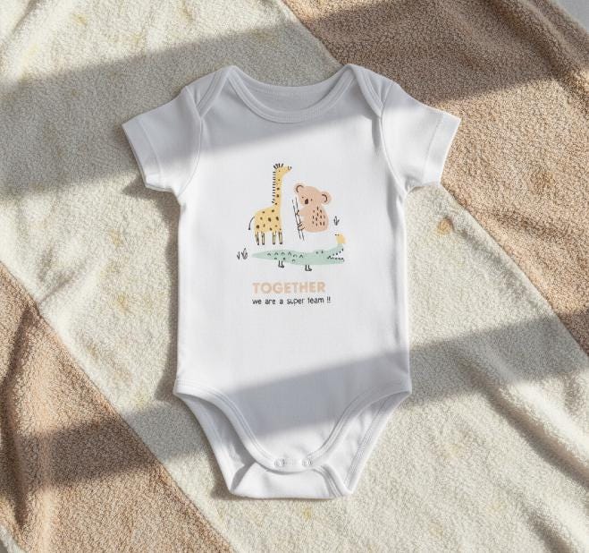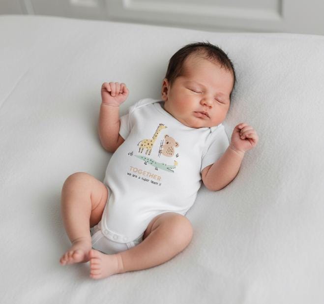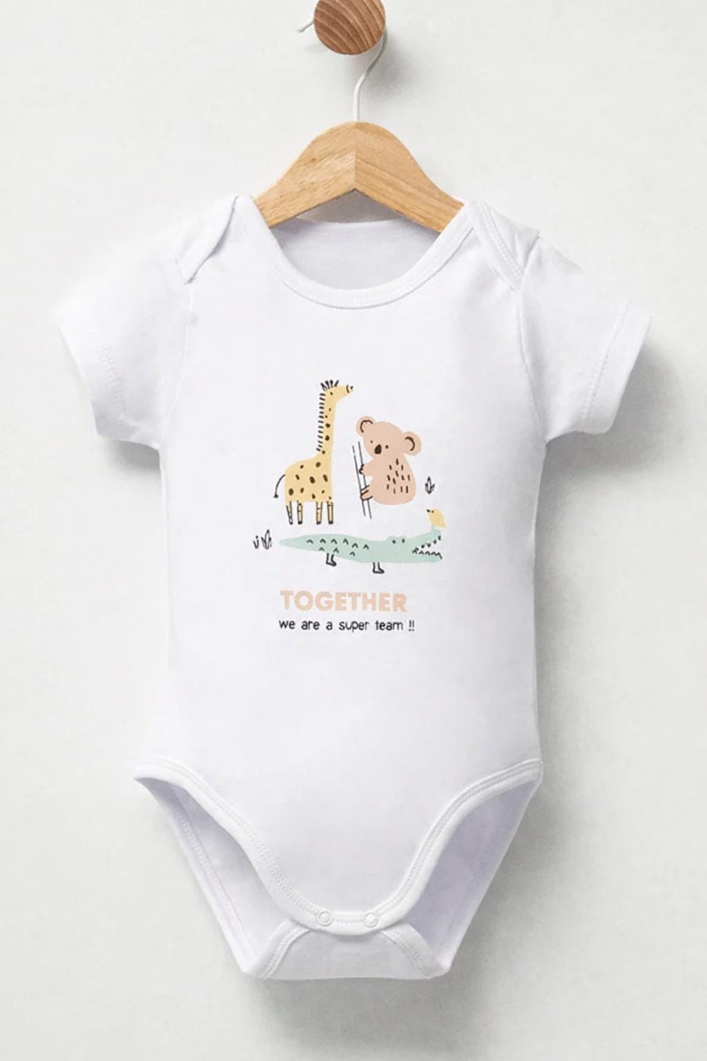 Searching for a baby onesie gift that feels thoughtful, not generic? This newborn bodysuit pairs an adorable animal illustration with the “Together Super Team” message—perfect for families who love clean, modern designs with meaning.
