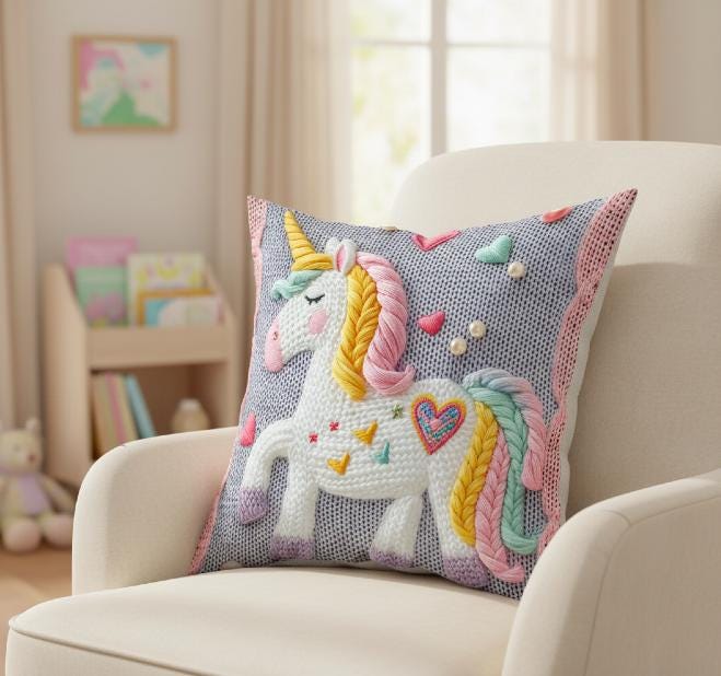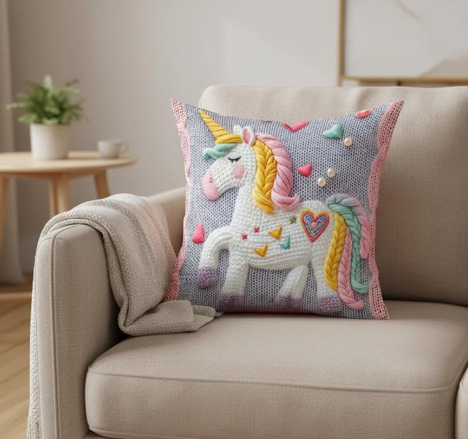 The detailed unicorn design creates a warm, storybook-inspired atmosphere, making this pillow a perfect accent for nurseries, kids bedrooms, playrooms, or reading corners. Its plush texture and elegant craftsmanship provide both comfort and visual appeal, ideal for decorative use on beds, chairs, or sofas.