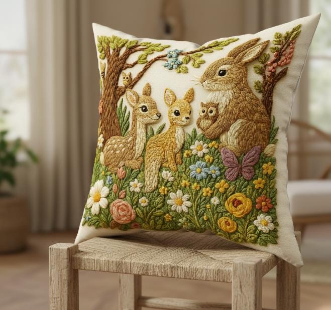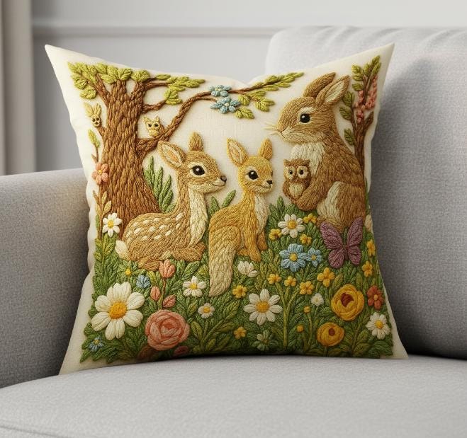 3D Digital Print Woodland Rabbit Pillow, Floral Nursery Cushion Decor