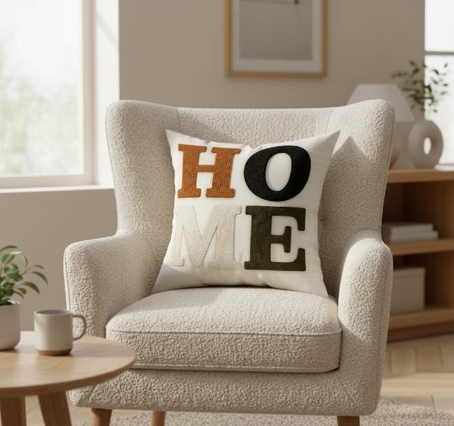 The bold yet minimal typography creates a cozy statement that feels both stylish and welcoming—perfect for modern, Scandinavian, or neutral interiors.