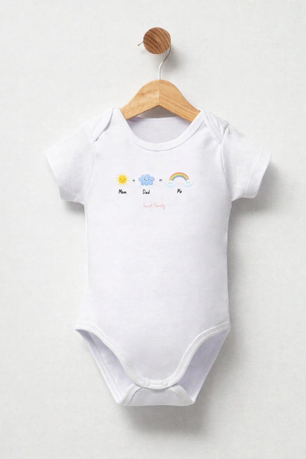 This modern baby bodysuit presents a refined family-inspired “Mom + Dad = Me” rainbow design, thoughtfully created for parents who value clean aesthetics and purposeful details.